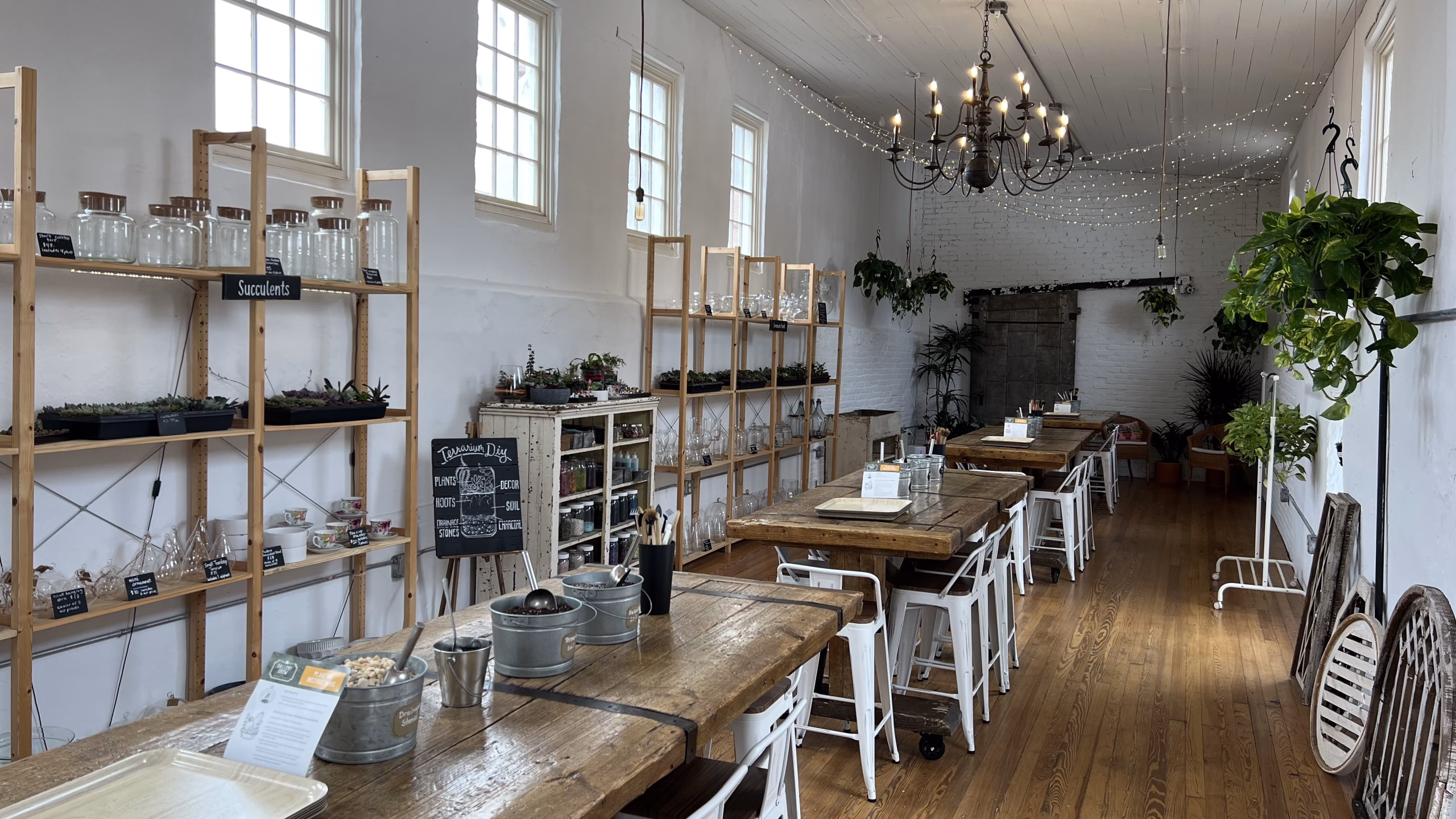Plant store, featuring build-your-own terrarium stations for personalized creations, plus houseplants, pots, local art, and embellishments