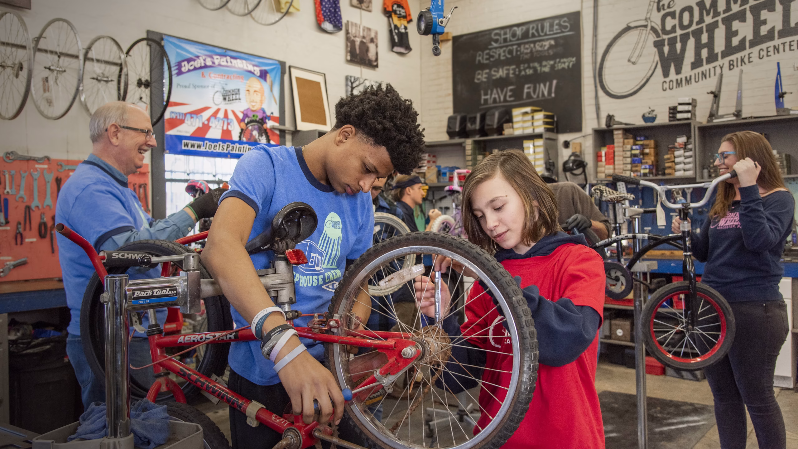 The Common Wheel is a nonprofit community bike organization that sells new and refurbished bikes and accessories along with repair services, community rides, and educational programs.