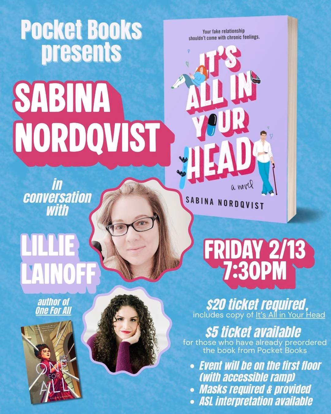 Author event alert! Pocket Books will be hosting Sabina Nordqvist on Friday 2/13 at 7:30pm at our Wheatland location to celebrate the release of her debut novel IT’S ALL IN YOUR HEAD, a delightful contemporary romance that centers disability representation. Sabina will be in conversation with Lillie Lainoff, author of ONE FOR ALL, and they will be taking questions and signing books after the talk. This event will be held on the first floor of our shop. Masks will be required at this event and will be provided for you. We will have ASL interpretation available for this event if needed–please leave a comment when you buy your ticket or email us by 2/2 to let us know if you will be using this service. Tickets are $20 for this event and include a copy of IT’S ALL IN YOUR HEAD. If you’ve already preordered the book from Pocket Books, you can select the $5 ticket instead! We will verify that you already have a book reserved and confirm with you.