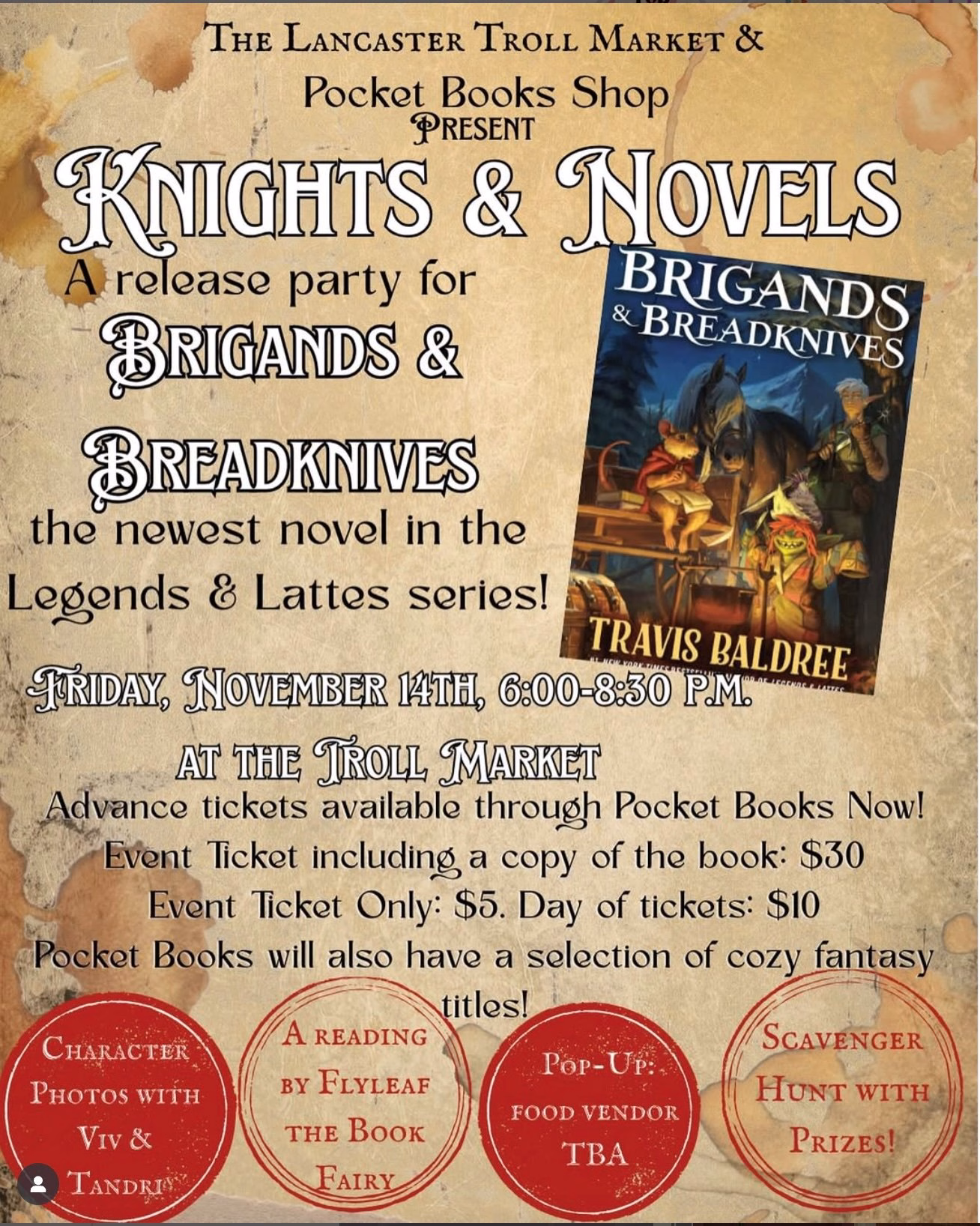 Join Pocket Books and the Lancaster Troll Market for a party celebrating the release of the newest book in the Legends & Lattes universe, Brigands and Breadknives. Food, character photos, a reading from the book, and prizes galore await you! We’ll also have a selection of other Travis Baldree titles & delightful cozy fantasy for you to browse and buy. Advanced registration suggested, as tickets at the door will be more expensive! A $30 ticket includes the book OR $5 without the book. At-the-door tickets will be $10 without the book.