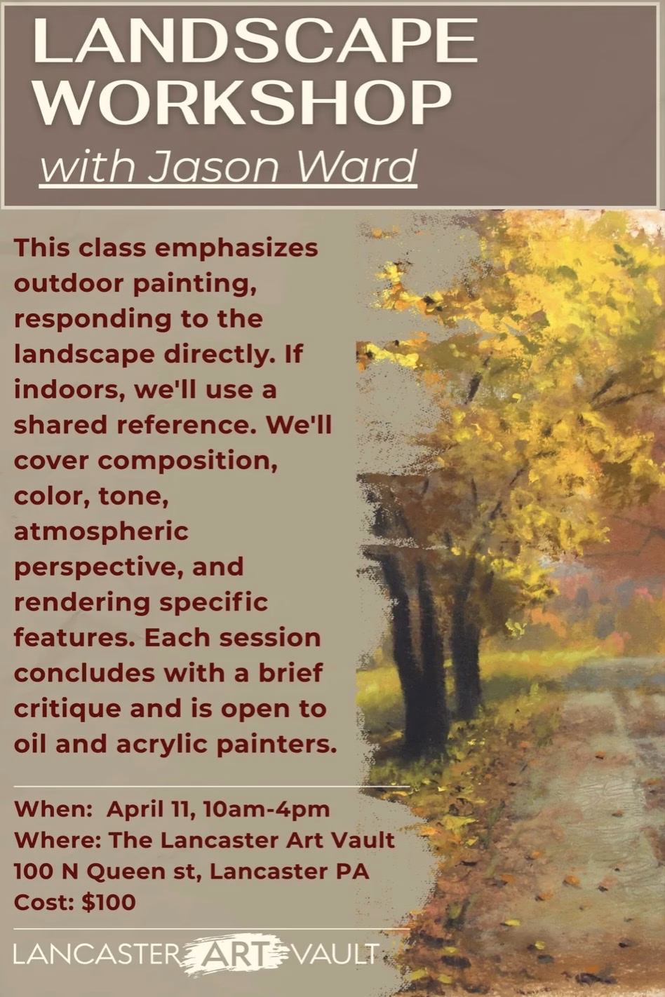 April 11, 2026 10AM-4PM – $100 per person This class takes us outdoors where we respond directly to what the landscape has to offer. If this class is held indoors we will be working from a shared reference. We’ll start by discussing the features of the landscape and some strategies for how to get the most out of our time painting. We’ll focus on finding a compelling composition, the use of color and tone, understanding the effects of atmospheric perspective to create a convincing sense of depth, as well as methods for rendering specific features of the scene. We end each class with a brief critique. This class is open to beginners and advanced students of any painting or drawing medium. Materials list: Painting oils/acrylics: – Paints: Titanium White, Burnt Sienna, Burnt Umber, Cadmium Red, Cadmium Yellow, Ultramarine BlueAll other colors are optional -Brushes: A variety of brush sizes and shapes, as well as, both stiff and soft bristles are recommended. -Palette Knife: I use a medium/small metal diamond shaped palette knife for both mixing and application of paint. -Artist Palette: A proper wood or glass palette is recommended, palette paper will work fine for this workshop. Please avoid creative substitutes (such as watercolor palettes, paper plates, anything wrapped in tinfoil, etc.) as they tend to cause problems during the painting process. -Surface: A primed and stretched canvas, or hardboard panel is best for painting. A heavy bodied paper, such as watercolor paper, will also work. -Lint Free Rags or paper Towels -(Optional) For oils -Turpentine, Odorless Turpiniod, or Mineral Spirits:Good for cleaning brushes, but I just use soap and water. For Acrylic- jar for water Drawing: Pencils and Graphite Sticks: A range of leads from H-B’s is recommended, however a classic #2 pencil is hard to beat. -Charcoal: Soft vine charcoal, compressed charcoal sticks, charcoal pencils, and charcoal powder are all recommended. -Erasers: A kneaded eraser and a rectangular white eraser are both great. I often use pink pencil cap erasers. -Artist Sandpaper Block or Stump: A great tool for toning a surface, and sharpening pencils and charcoal sticks. -Surface: For graphite I recommend a heavy bodied hot press paper such as Bristol Vellum. For Charcoal, a heavy bodied charcoal or watercolor paper will work. My preferred paper for charcoal is Rives BFK. -Paper Towels and Artist brushes: For blending. REGISTER HERE