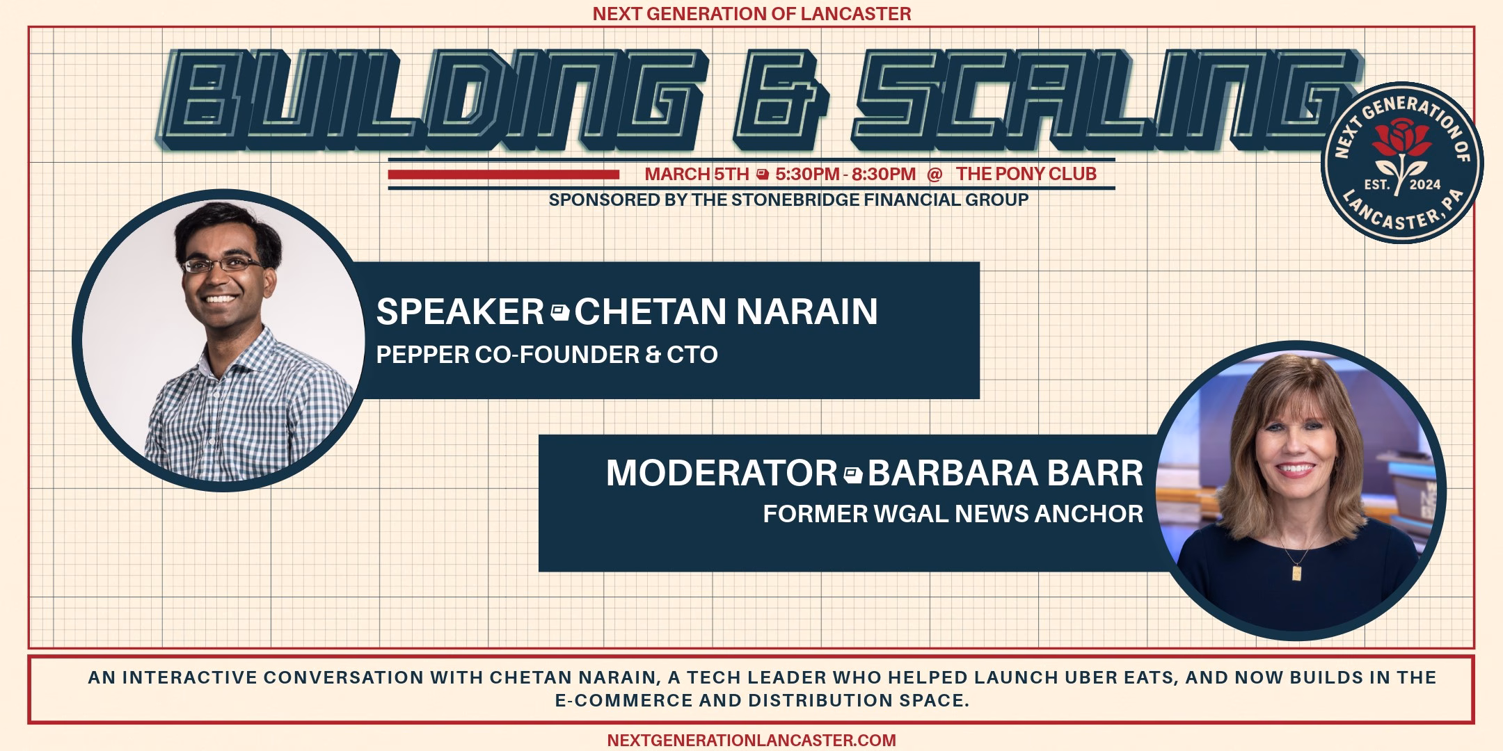 Join Next Generation of Lancaster for an interactive conversation with Chetan Narain, an entrepreneur and tech leader who helped launch Uber Eats in its early days and now builds in the ecommerce and distribution space as the co-founder and CTO of Pepper. Moderated by Barbara Barr, this session will focus on real lessons from the founder journey, from the early scrappy days of getting traction to the systems and leadership needed to scale. This event would not be possible without the support of our headline sponsor, Stonebridge Financial Group.