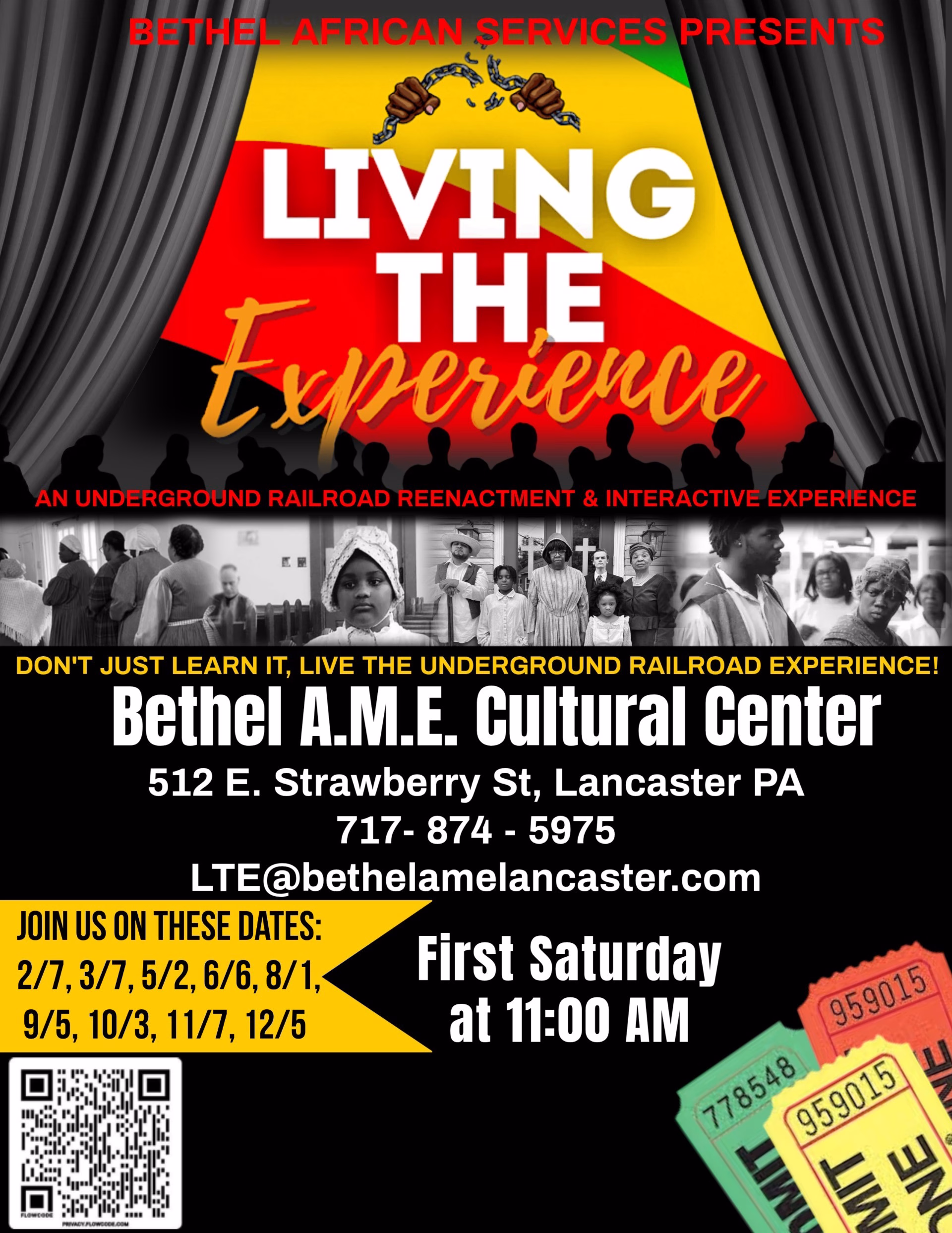 One of Lancaster County’s most moving and powerfully significant hidden gems, Living the Experience is a creative, spiritual, and interactive historical reenactment of the Underground Railroad, at the Historical Bethel African Methodist Episcopal Church in the City of Lancaster. Living The Experience (LTE) is the first Underground Railroad reenactment in Central Pennsylvania made available with a regular schedule of performances. It has been presented to groups from all over the nation, and as far away as Australia, Alaska, Africa, and Europe. This Underground Railroad living history program is presented interactively in first person interpretation in an effort to bring alive the people, places, and events of Lancaster County. The program actively engages its audiences in the learning of Lancaster’s involvement in the Underground Railroad and also its involvement as a free community of Africans. Those who attend are provided an honest portrayal of the experiential realities of those involved in the Underground Railroad and how relevant the history is in these current times. From the stories that are told, the spirituals that are sung, and in the emotional connections that are felt, people are provided an opportunity to learn and to gain a clearer perspective on the events and the people involved. Following the reenactment, a southern style meal is served, and local vendors are on site. For 28 years, this story has been told as we would love to make it yours! Step into history like never before. Come live the experience! Ticket Prices: 13- Adult 42.50 Senior (60 and up) 40.00 Child (6-12) 24.50 Child (5 and under) FREE