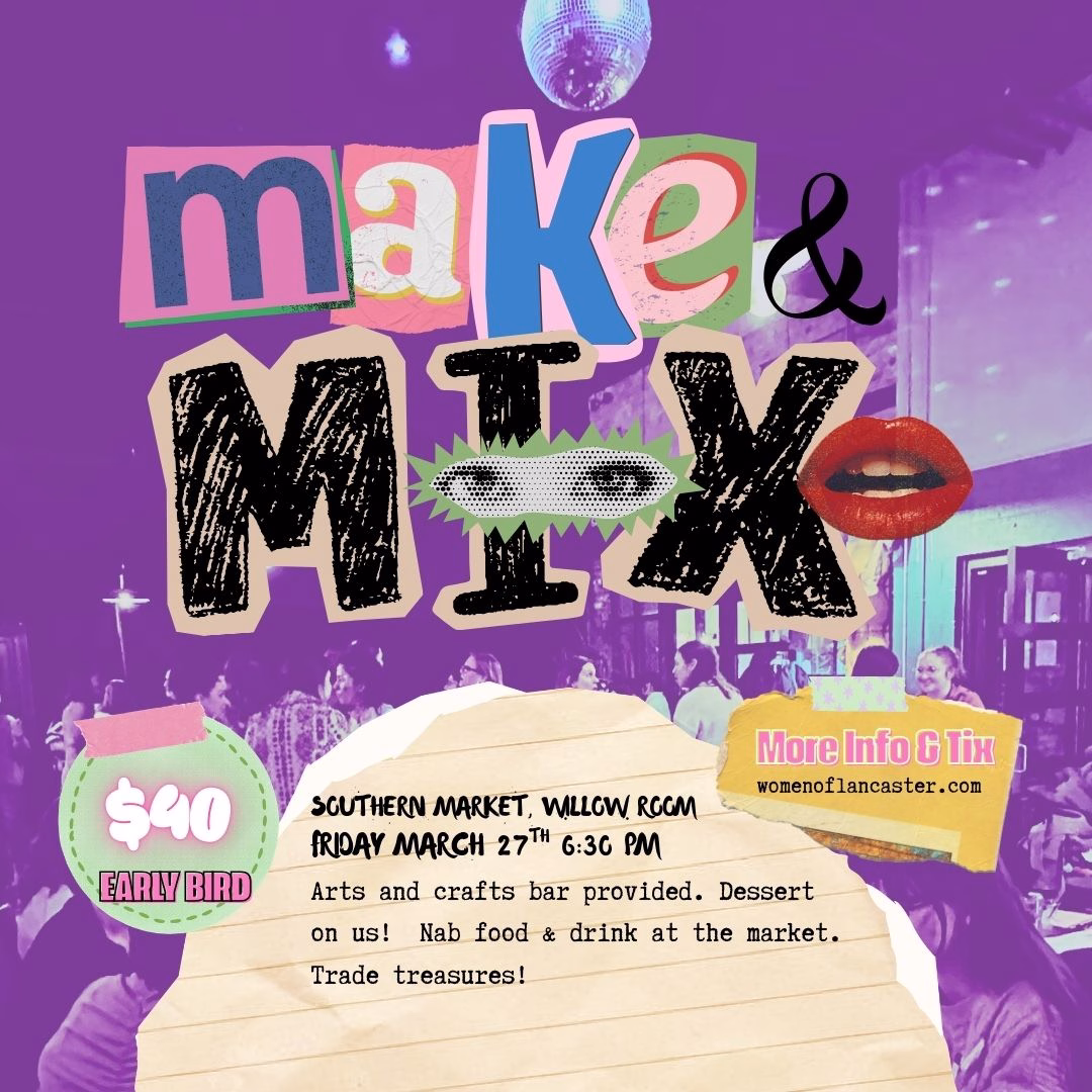 Make & Mix at the Market is an indulgent Friday night created to celebrate Women’s Month. It’s equal parts creative, social, and just a little bit luxurious. We’re taking over Southern Market’s stunning Willow Room for an evening of music, cupcakes, crafts, cocktails, and a trinket trading table that adds a little nostalgia and surprise to the night. This isn’t a structured networking event, and it’s not a sit-down workshop. It’s a thoughtfully designed space where your hands are busy, the pressure is off, and conversation happens naturally. Paint, sculpt, sip something good, wander for another bite, switch seats halfway through, or settle into one great conversation and stay there. You’ll leave with a few small treasures, new connections, and the kind of Friday night that feels good the next morning. Remember, our last event sold out a full week in advance, and capacity in the Willow Room is limited. WHAT’S INCLUDED: ✨ A Full Arts & Craft Bar: Painting, mini canvases, ceramics, air-dry clay, and a few fun surprise options. Bring your own project if you’d like. 🧁 Dessert from Lancaster Cupcake Co 🎶 The Atmosphere: Great music, a cozy private space 💍 A Trinket Trading Table: Bring something small. Take something new home. Leftovers donated to charity. 🍷 Full access to Southern Market’s food + drink vendors. 💜 A safe, inclusive space — always LGBTQIA+ friendly. WHERE AND WHEN: 📍 Southern Market | Willow Room Friday, March 27th – 6:30 PM – 9:30 PM $40 Early Bird (through March 16th) | $50 standard Limited capacity. All ticket sales are final. Sales close March 23rd to allow adequate planning time. This is event for all women ages 21+