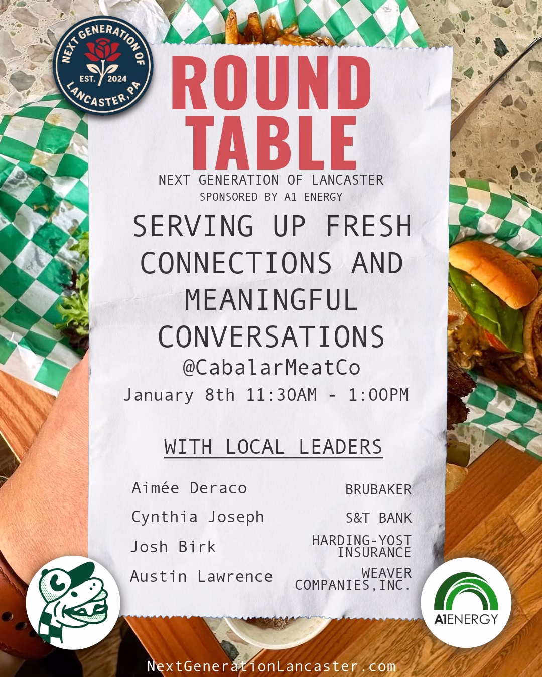 Join us for the Next Gen Round Table as we partner with Cabalar Meat Co. and bring together four local leaders for an interactive, small-group learning experience. Attendees will rotate between each leader in twenty-minute sessions. Every leader will follow a structured guide, and guests will receive thoughtful questions to help spark meaningful conversation. This event is designed to build relationships, share insights, and create an approachable space to learn from leaders in our community. This series is proudly sponsored by A1 Energy.