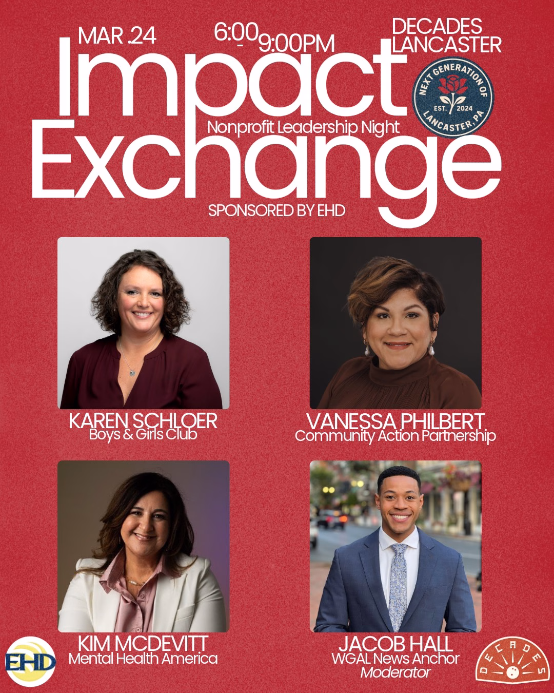 Get ready to dive deep into the world of nonprofit leadership and make a difference while having a blast! All net proceeds from this event will go back toward the nonprofits. Join Next Generation of Lancaster for Nonprofit Leadership Night at Decades, an evening built around awareness, community impact, and real conversations with local nonprofit leaders. This event will feature a moderated panel with executive directors from the Boys and Girls Club of Lancaster County, Community Action Partnership, and Mental Health America of Lancaster County. The discussion will be led by WGAL news anchor Jacob Hall and will highlight the work being done across Lancaster, the challenges nonprofits face, and how the community can get involved and support their missions. Come early, grab food, enjoy the Decades atmosphere, and stay after for bowling, arcade games, and networking. Special thanks to our Headline Sponsor, EHD Insurance, for helping make this event possible.