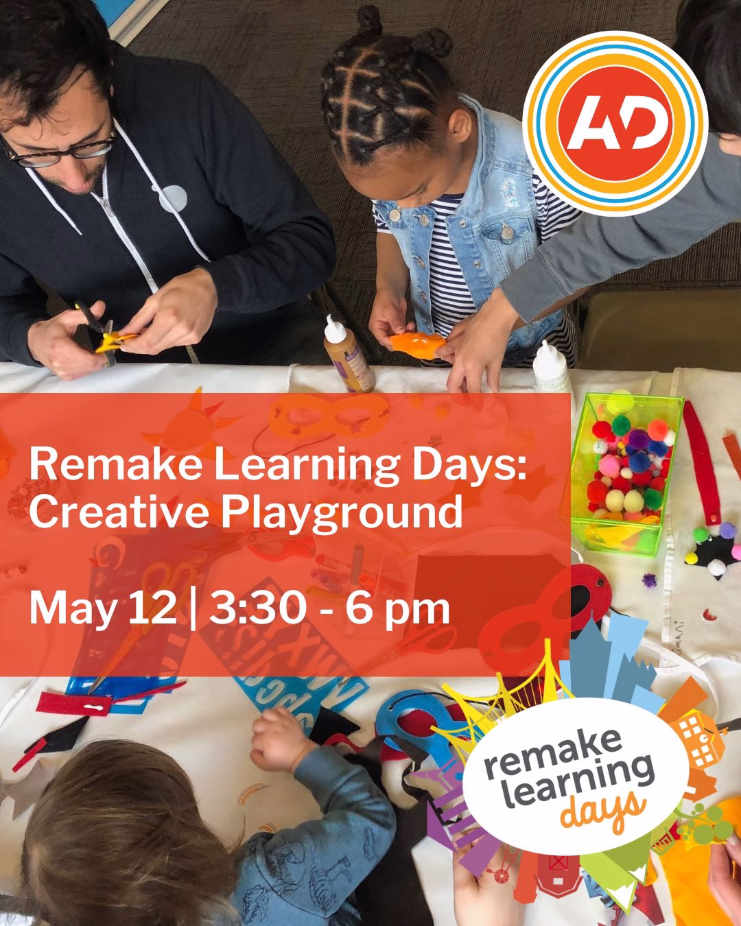 Creative Playground is a hands-on, come-and-go community art event celebrating imagination, collaboration, and making together as families hosted by the Center for Creative Exploration at Pennsylvania College of Art & Design along with community partners. This event takes place 3:30 – 6 pm The Center for Creative Exploration at Pennsylvania College of Art & Design will be hosting a giant making table open for the full duration—inviting artists of all ages to tinker, build, and create freely. Peace Kids to the Rescue will guide children and adults through a collaborative monoprinting experience using cake pans and paints. From 3:30–5:00 pm, Lancaster TotSpot will host We Built This City!, a collaborative project exploring community, architecture, and sculpture as participants work together to design and embellish a city inspired by real-life surroundings or pure imagination. Geared toward children ages 2–10 and their caregivers—but welcoming creators of all ages—this activity emphasizes teamwork and storytelling through building. And beginning at 4:30 pm, Hillside Place Studio will offer a quieter, low-key mixed media experience inspired by the book We Share This Neighborhood. Through collage, assemblage, and experimentation, participants will reflect on ideas of neighborhood and belonging, creating small works that express what community means to them in a calm, welcoming space. Join us for a playful, process-focused evening of activities designed to encourage shared creativity between adults and kids. This event is free and open to the public. Please register so we know how much fun to have on hand! RSVP Link: https://forms.gle/pvXmjr3TzzTfXxEE8 Drop in any time between 3:30 – 6 pm on May 12, 2026. Check out the event listing on the Remake Learning Day website.