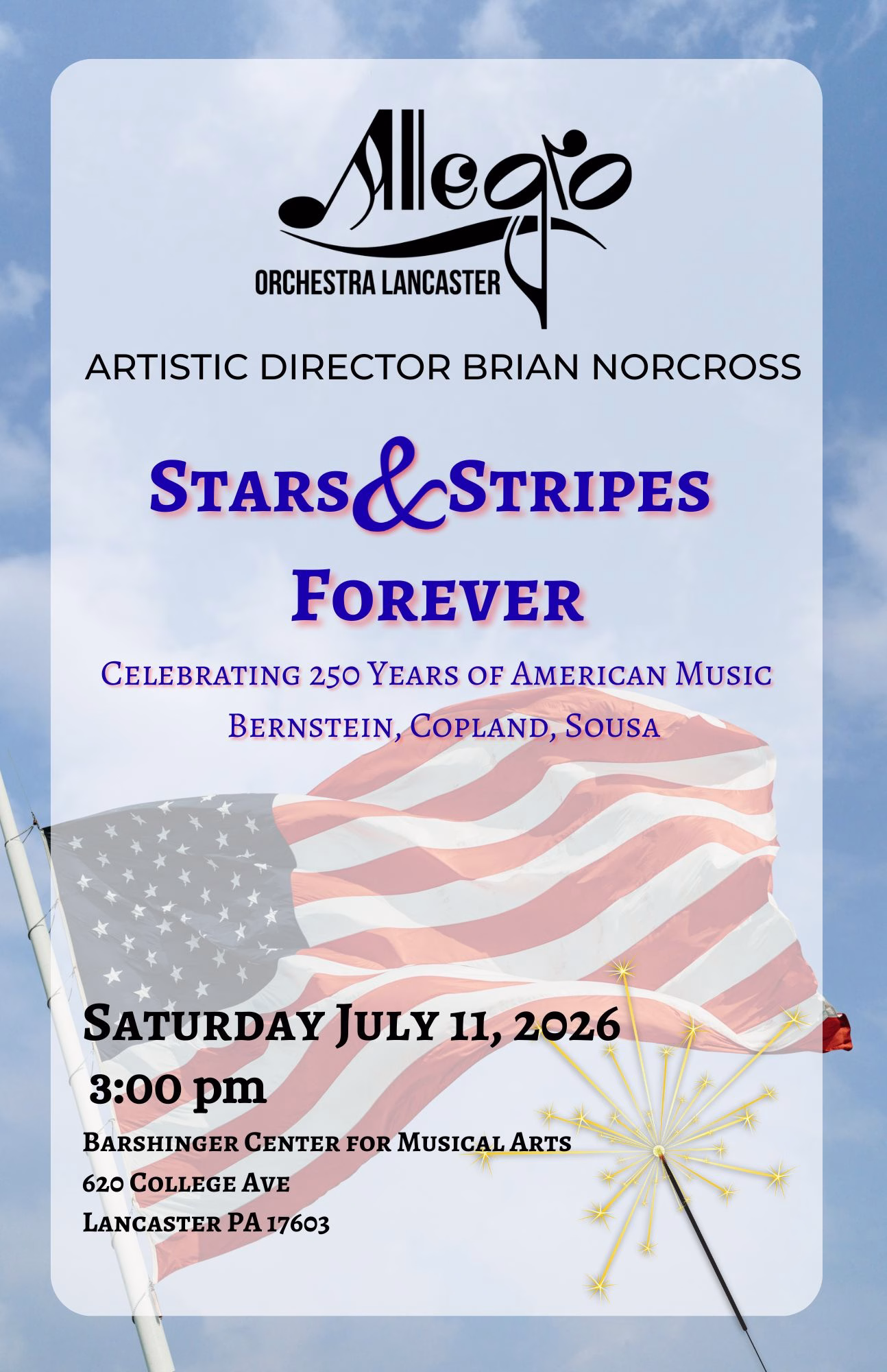 Join Allegro Orchestra for an afternoon celebrating 250 years of American music! From Bernstein and Copland to Florence Price and John Williams, and of course including the iconic John Phillip Sousa’s “Stars and Stripes Forever,” this concert will inspire appreciation and love for the rich history of music in the USA! The full Allegro Orchestra will fill the hall of Barshinger Center with joyful music!